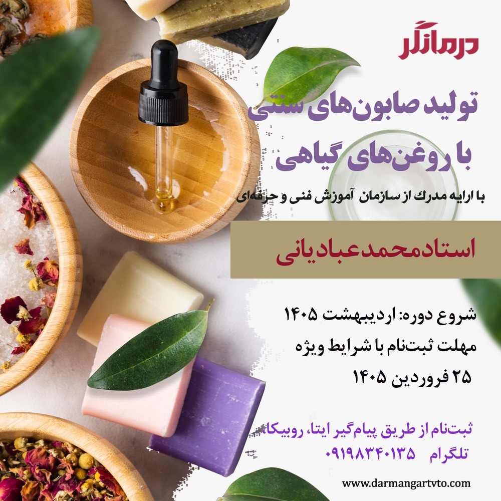 به گزارش درمانگر، دوره «تولید صابونهای سنتی با روغنهای گیاهی» توسط آموزشگاه درمانگر و با حضور استاد محمد عبادیانی برگزار میشود. این دوره آموزشی با ارائه مدرک معتبر از سازمان فنی و حرفهای برگزار میشود.